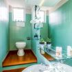 Il bagno, caratterizzato da un'elegante piastrellatura verde, è dotato di tutti i comfort, inclusi prodotti da bagno gratuiti e un’illuminazione perfetta per iniziare la giornata con energia.