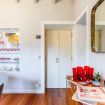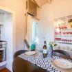 Il cucinotto, compatto ma ben attrezzato, include tutto il necessario per preparare un pasto delizioso: piano a induzione, forno, microonde, frigorifero e stoviglie di design. La zona pranzo, arredata con un tavolo rotondo e sedie imbottite, è perfetta per godersi una cena romantica con vista sui dettagli decorativi unici dell’appartamento.