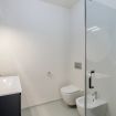 Bagno moderno con box doccia, asciugacapelli e set di cortesia.