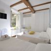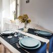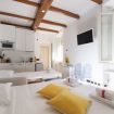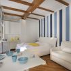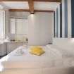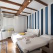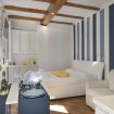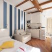 All’interno troverai un ambiente chic e curato, con travi in legno a vista che conferiscono un tocco rustico, perfettamente bilanciato con lo stile moderno e funzionale. Le righe blu e bianche delle pareti creano un’atmosfera vivace e fresca. Il letto matrimoniale accogliente è affiancato da un divano letto per eventuali ospiti extra, mentre il tavolino da pranzo in plexiglass trasparente è perfetto per gustare una cena intima o lavorare da remoto.