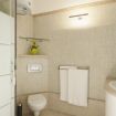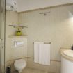 Il bagno è moderno e funzionale, con una doccia spaziosa, asciugamani freschi e set cortesia a disposizione degli ospiti. Gli accenti decorativi, come i vasi di fiori e i tocchi di giallo brillante, danno un ulteriore senso di accoglienza e freschezza.