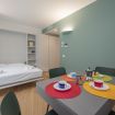 - Zona notte e soggiorno: Letto matrimoniale a scomparsa, divano, Smart TV 40'' con streaming incluso, tavolo da pranzo con 4 sedie