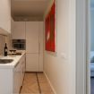 Proseguendo, troverete un luminoso soggiorno arredato con un comodo divano e una zona pranzo con tavolo e sedie. Qui potrete rilassarvi davanti alla TV a schermo piatto o lavorare alla scrivania dedicata. L'angolo cottura è completamente attrezzato con piano cottura a induzione, frigorifero e tutto il necessario per preparare i pasti.